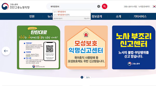 고용노동부 홈페이지의 재직증명서
